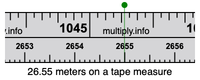 26.55 meters times 100 equals 2655 centimeters. Therefore, 26.55 meters is at the 2655 centimeters place on the tape measure, as displayed below.