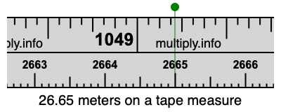 26.65 meters times 39.3701 equals 1049.213165 inches. Therefore, 26.65 meters is also at the 1049.213165 inches place on the tape measure, as displayed above.