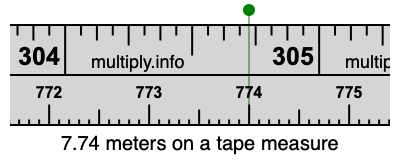 7.74 meters times 100 equals 774 centimeters. Therefore, 7.74 meters is at the 774 centimeters place on the tape measure, as displayed below.