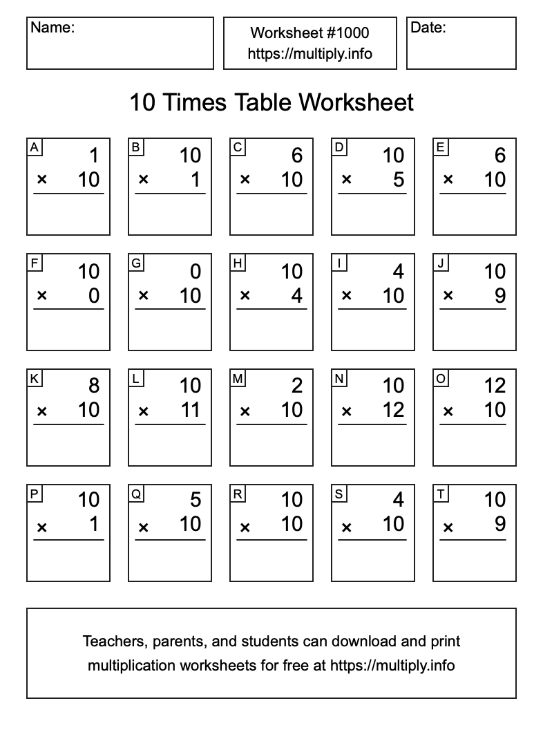 Here is the 10 Times Table Worksheet #1000. This worksheet contains problems related to the multiplication table of 10. Print and/or save the worksheet using the buttons below the image. You can also drag or right-click on the image to download it to your device.
