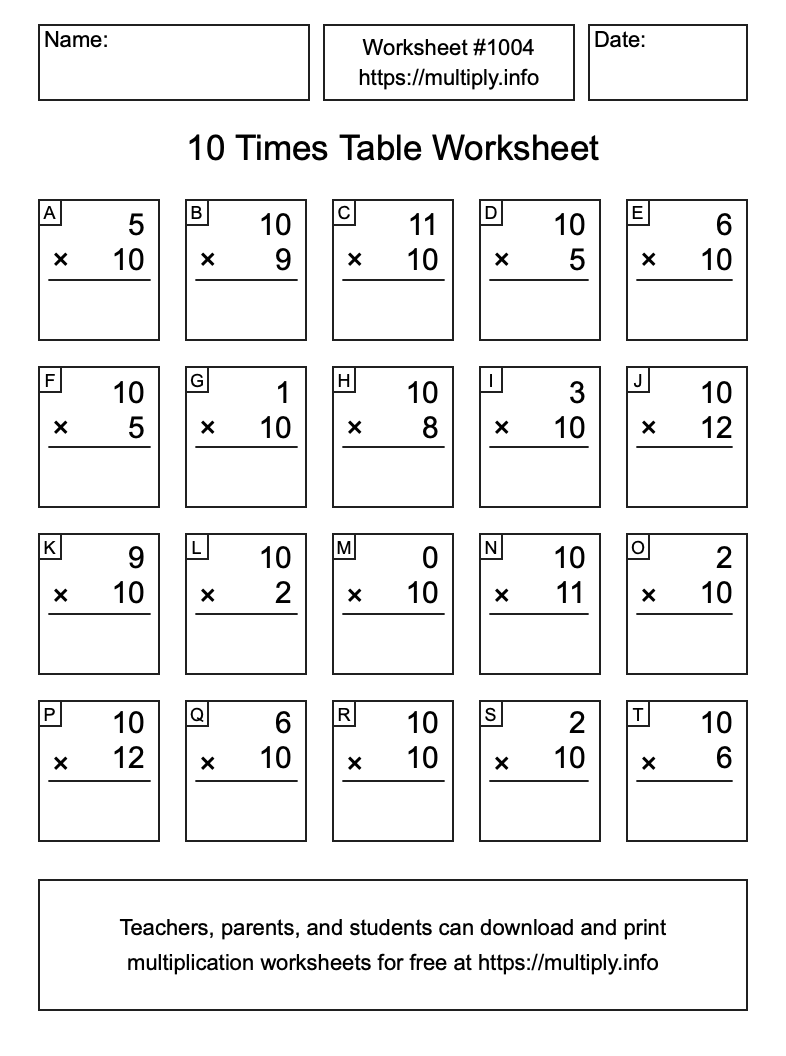 Here is the 10 Times Table Worksheet #1004. This worksheet contains problems related to the multiplication table of 10. Print and/or save the worksheet using the buttons below the image. You can also drag or right-click on the image to download it to your device.