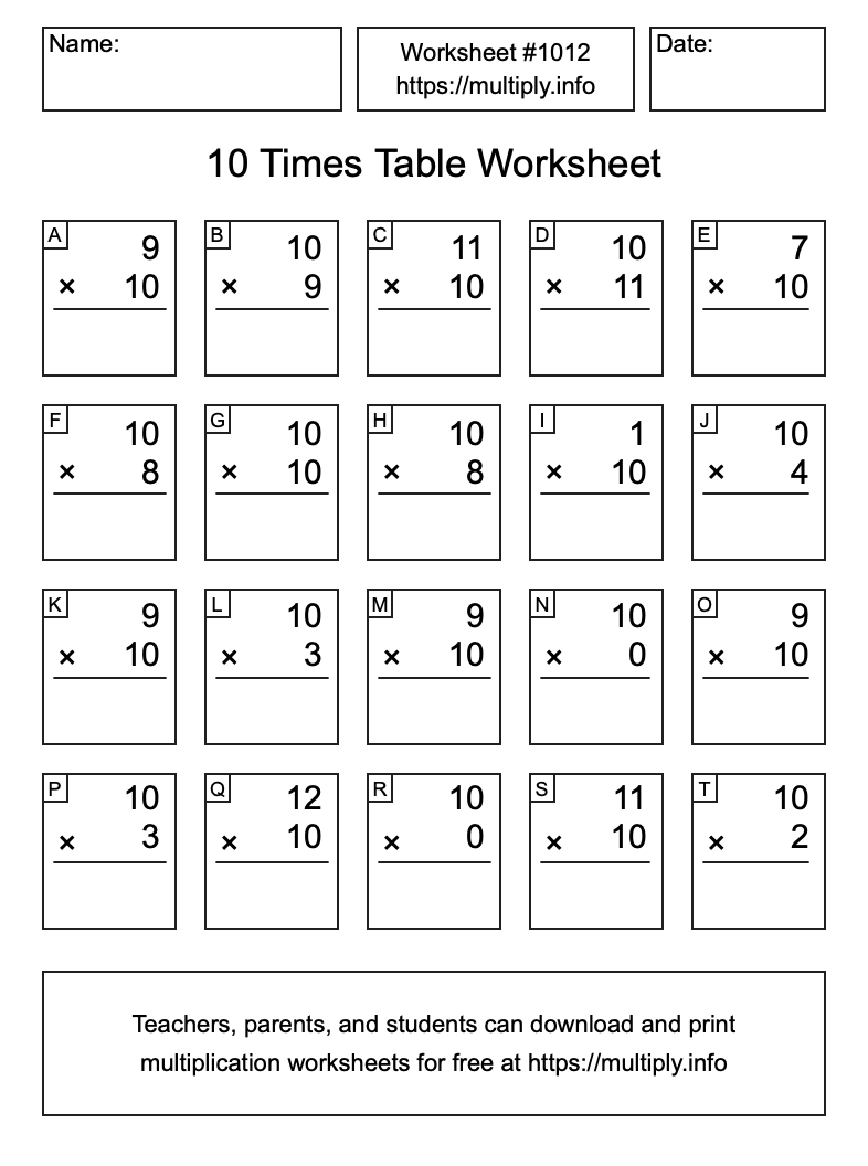 Here is the 10 Times Table Worksheet #1012. This worksheet contains problems related to the multiplication table of 10. Print and/or save the worksheet using the buttons below the image. You can also drag or right-click on the image to download it to your device.