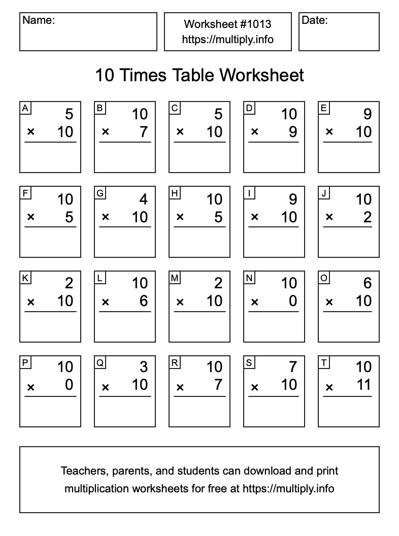 Here is the 10 Times Table Worksheet #1013. This worksheet contains problems related to the multiplication table of 10. Print and/or save the worksheet using the buttons below the image. You can also drag or right-click on the image to download it to your device.