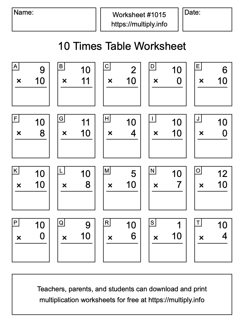 10 Times Table Worksheet #1016