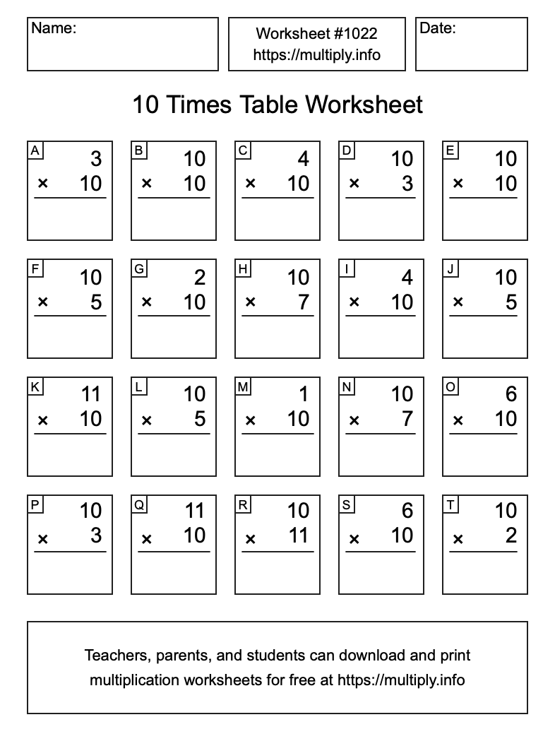 Here is the 10 Times Table Worksheet #1022. This worksheet contains problems related to the multiplication table of 10. Print and/or save the worksheet using the buttons below the image. You can also drag or right-click on the image to download it to your device.