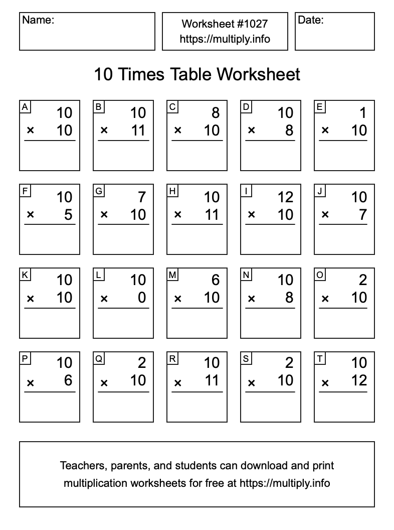 Here is the 10 Times Table Worksheet #1027. This worksheet contains problems related to the multiplication table of 10. Print and/or save the worksheet using the buttons below the image. You can also drag or right-click on the image to download it to your device.