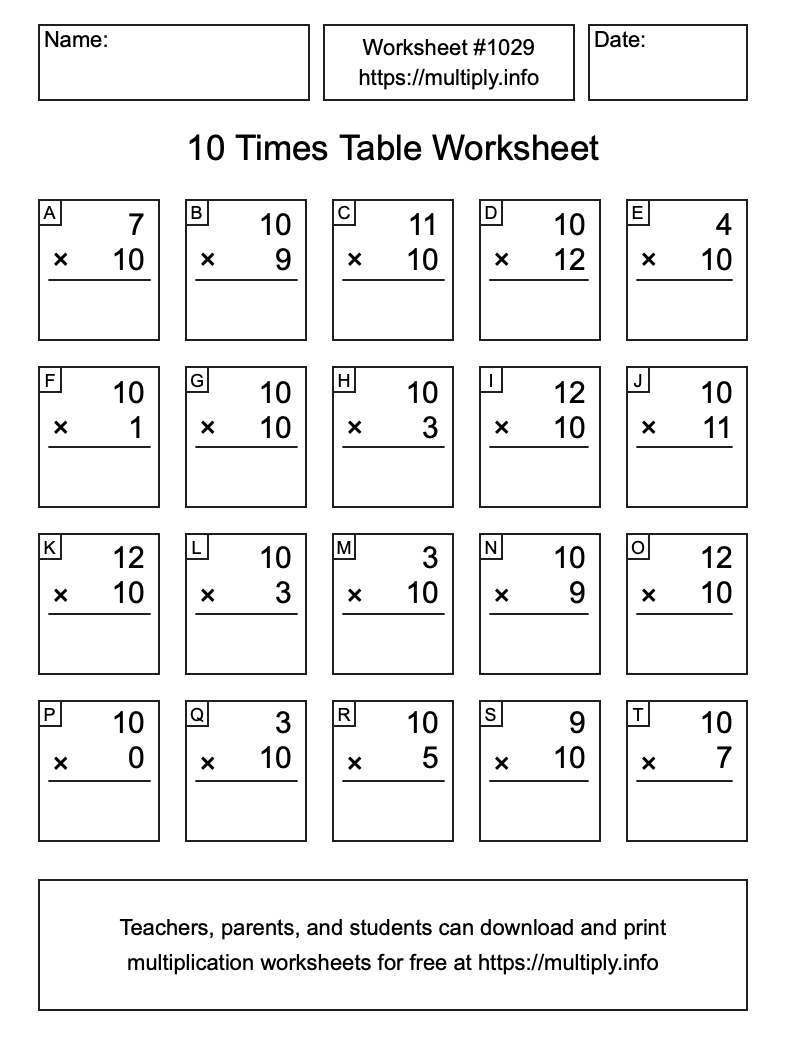 Here is the 10 Times Table Worksheet #1029. This worksheet contains problems related to the multiplication table of 10. Print and/or save the worksheet using the buttons below the image. You can also drag or right-click on the image to download it to your device.