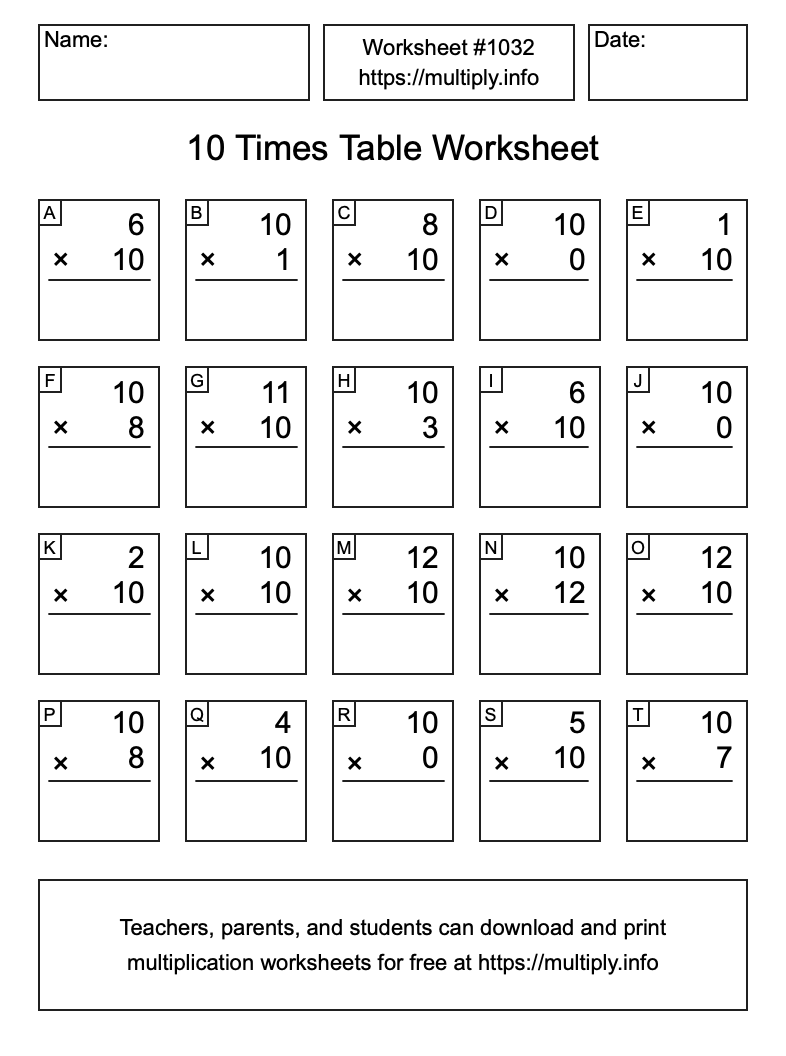 Here is the 10 Times Table Worksheet #1032. This worksheet contains problems related to the multiplication table of 10. Print and/or save the worksheet using the buttons below the image. You can also drag or right-click on the image to download it to your device.