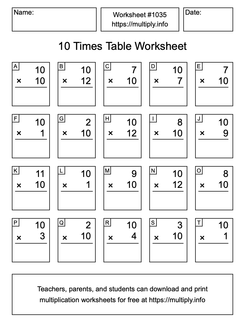 Here is the 10 Times Table Worksheet #1035. This worksheet contains problems related to the multiplication table of 10. Print and/or save the worksheet using the buttons below the image. You can also drag or right-click on the image to download it to your device.