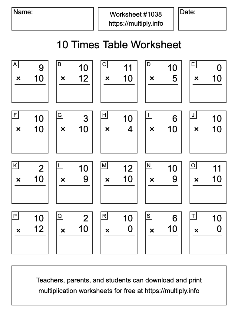 Here is the 10 Times Table Worksheet #1038. This worksheet contains problems related to the multiplication table of 10. Print and/or save the worksheet using the buttons below the image. You can also drag or right-click on the image to download it to your device.