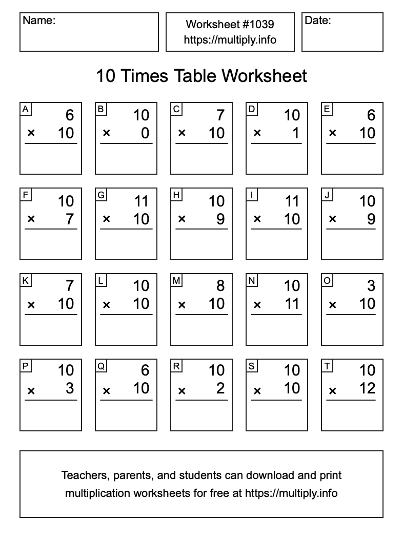 Here is the 10 Times Table Worksheet #1039. This worksheet contains problems related to the multiplication table of 10. Print and/or save the worksheet using the buttons below the image. You can also drag or right-click on the image to download it to your device.