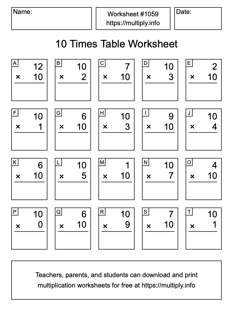 Here is the 10 Times Table Worksheet #1059. This worksheet contains problems related to the multiplication table of 10. Print and/or save the worksheet using the buttons below the image. You can also drag or right-click on the image to download it to your device.