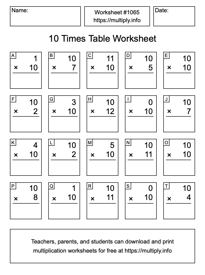 Here is the 10 Times Table Worksheet #1065. This worksheet contains problems related to the multiplication table of 10. Print and/or save the worksheet using the buttons below the image. You can also drag or right-click on the image to download it to your device.