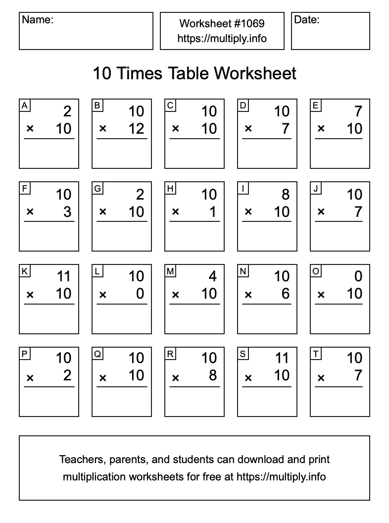10 Times Table Worksheet #1070