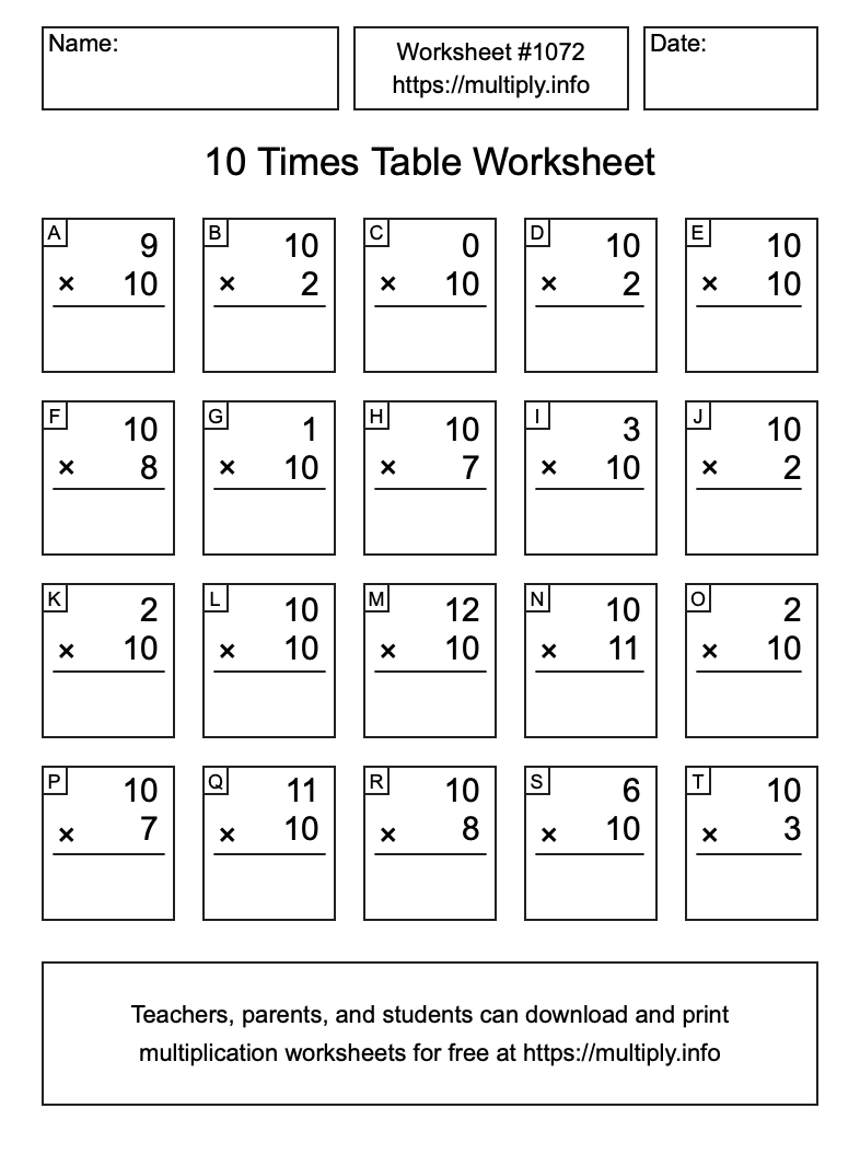 Here is the 10 Times Table Worksheet #1072. This worksheet contains problems related to the multiplication table of 10. Print and/or save the worksheet using the buttons below the image. You can also drag or right-click on the image to download it to your device.