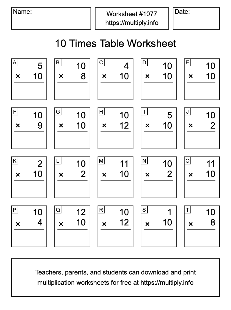 Here is the 10 Times Table Worksheet #1077. This worksheet contains problems related to the multiplication table of 10. Print and/or save the worksheet using the buttons below the image. You can also drag or right-click on the image to download it to your device.