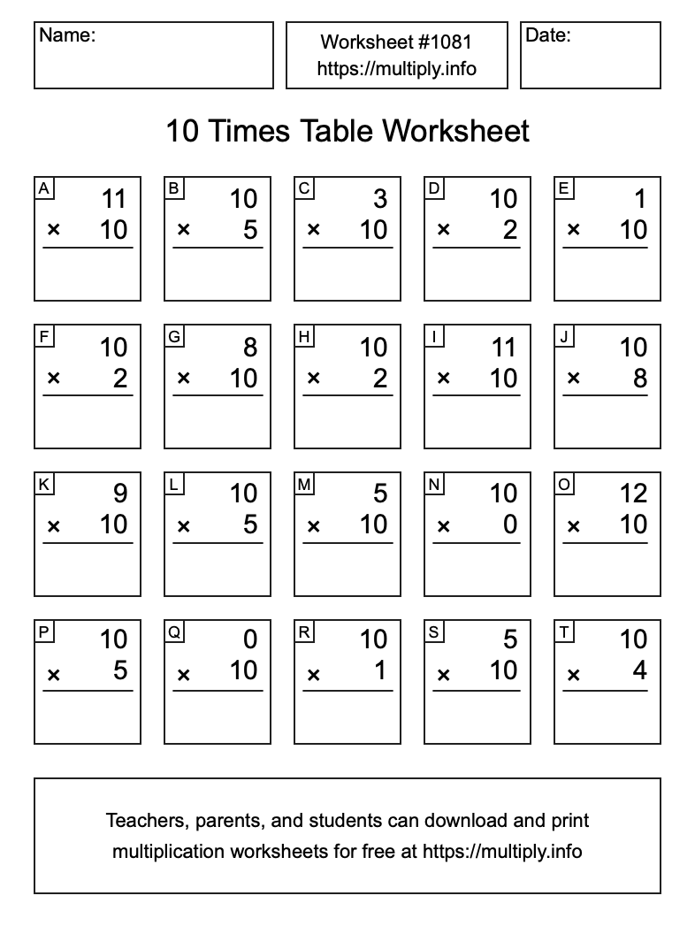 10 Times Table Worksheet #1082