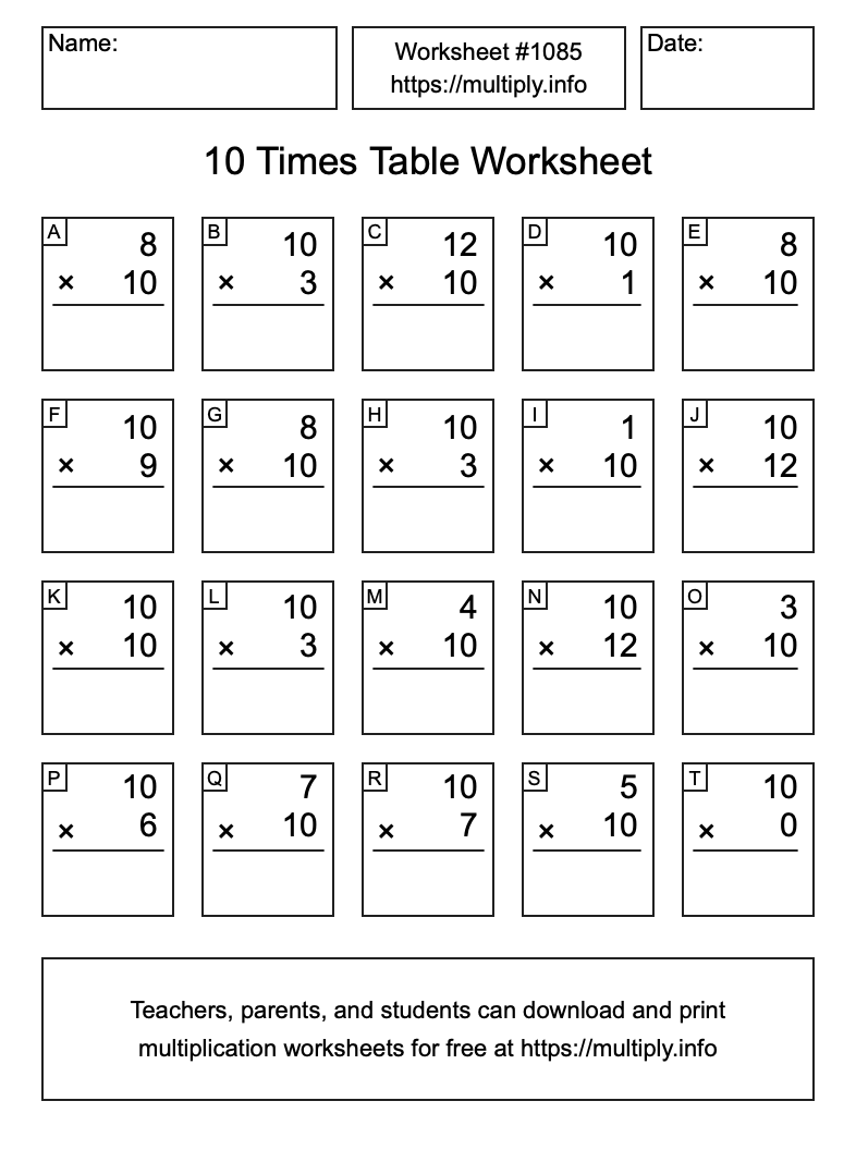 10 Times Table Worksheet #1086