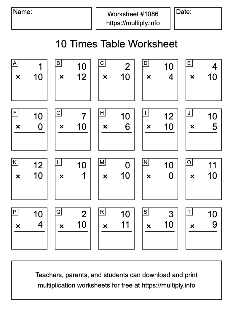 10 Times Table Worksheet #1087