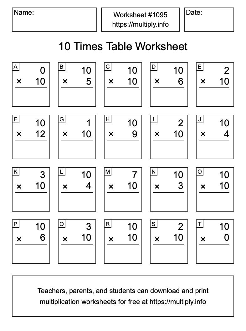 Here is the 10 Times Table Worksheet #1095. This worksheet contains problems related to the multiplication table of 10. Print and/or save the worksheet using the buttons below the image. You can also drag or right-click on the image to download it to your device.
