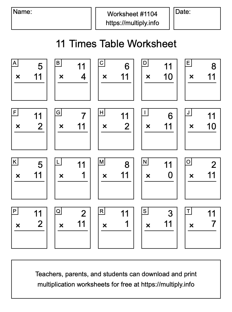 Here is the 11 Times Table Worksheet #1104. This worksheet contains problems related to the multiplication table of 11. Print and/or save the worksheet using the buttons below the image. You can also drag or right-click on the image to download it to your device.