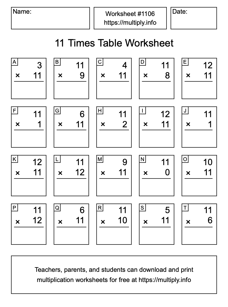 Here is the 11 Times Table Worksheet #1106. This worksheet contains problems related to the multiplication table of 11. Print and/or save the worksheet using the buttons below the image. You can also drag or right-click on the image to download it to your device.