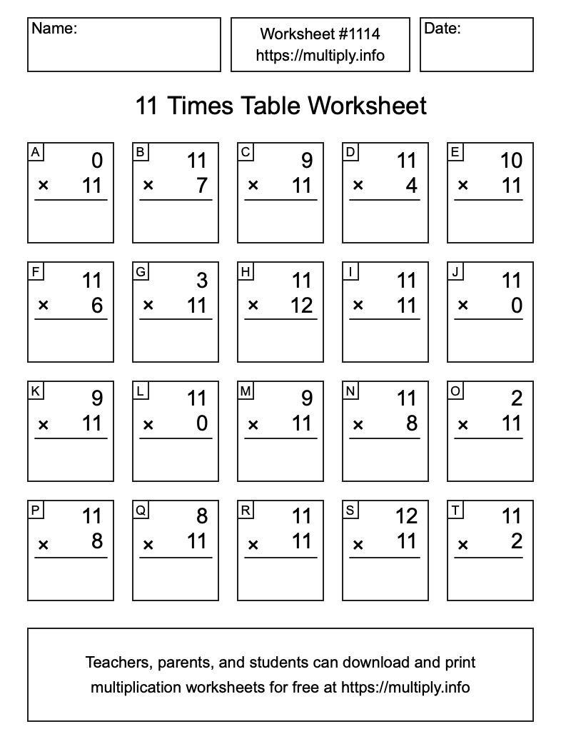 Here is the 11 Times Table Worksheet #1114. This worksheet contains problems related to the multiplication table of 11. Print and/or save the worksheet using the buttons below the image. You can also drag or right-click on the image to download it to your device.