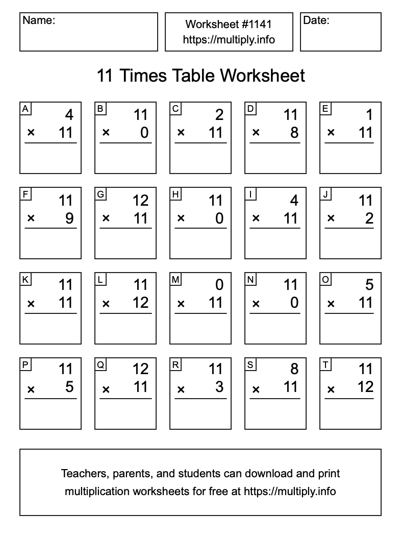 11 Times Table Worksheet #1142