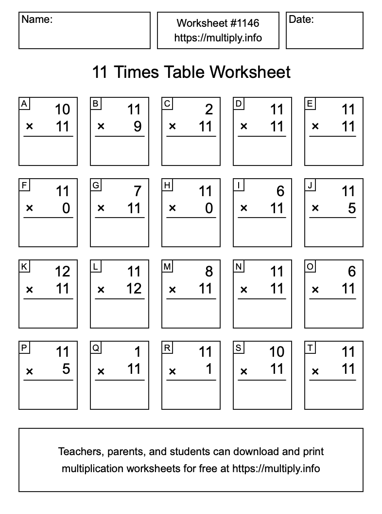 Here is the 11 Times Table Worksheet #1146. This worksheet contains problems related to the multiplication table of 11. Print and/or save the worksheet using the buttons below the image. You can also drag or right-click on the image to download it to your device.