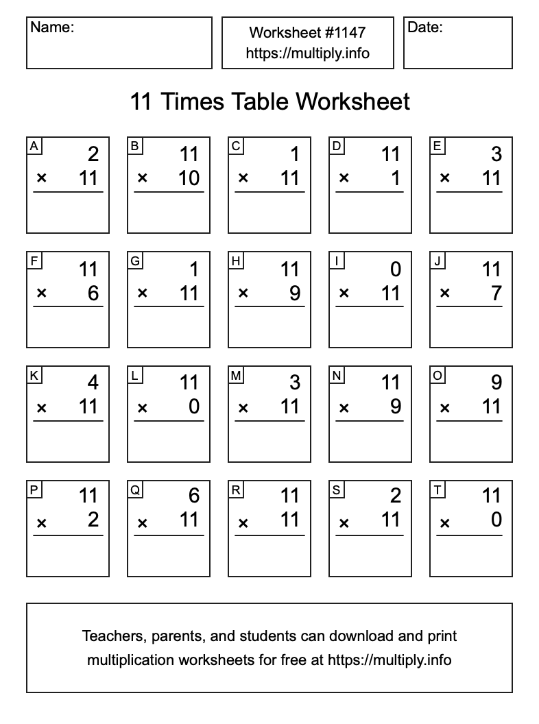 Here is the 11 Times Table Worksheet #1147. This worksheet contains problems related to the multiplication table of 11. Print and/or save the worksheet using the buttons below the image. You can also drag or right-click on the image to download it to your device.