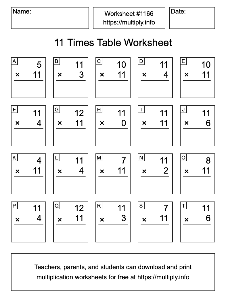 Here is the 11 Times Table Worksheet #1166. This worksheet contains problems related to the multiplication table of 11. Print and/or save the worksheet using the buttons below the image. You can also drag or right-click on the image to download it to your device.