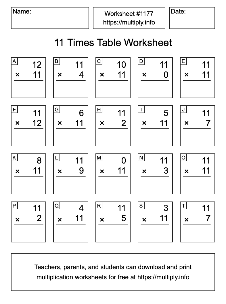 Here is the 11 Times Table Worksheet #1177. This worksheet contains problems related to the multiplication table of 11. Print and/or save the worksheet using the buttons below the image. You can also drag or right-click on the image to download it to your device.
