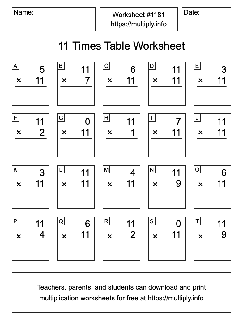 Here is the 11 Times Table Worksheet #1181. This worksheet contains problems related to the multiplication table of 11. Print and/or save the worksheet using the buttons below the image. You can also drag or right-click on the image to download it to your device.