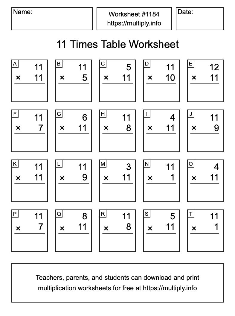 Here is the 11 Times Table Worksheet #1184. This worksheet contains problems related to the multiplication table of 11. Print and/or save the worksheet using the buttons below the image. You can also drag or right-click on the image to download it to your device.