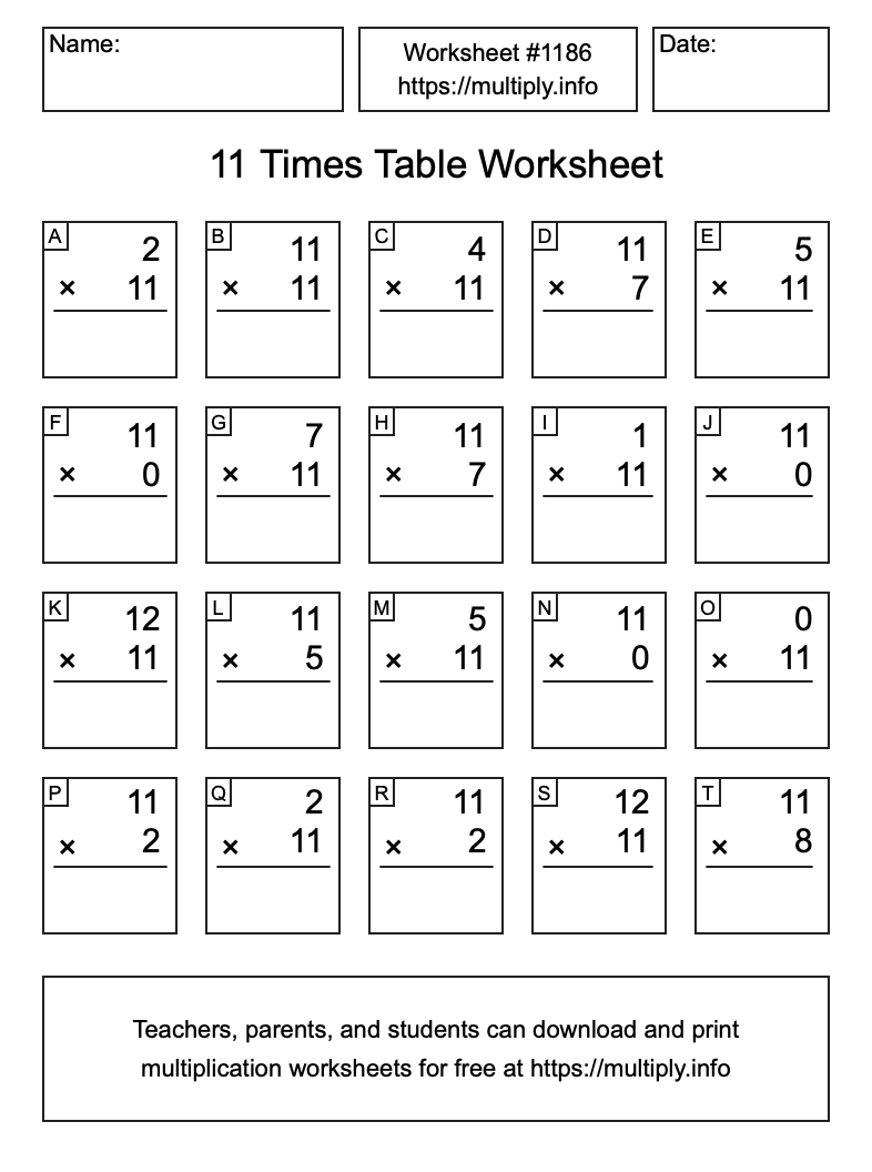 Here is the 11 Times Table Worksheet #1186. This worksheet contains problems related to the multiplication table of 11. Print and/or save the worksheet using the buttons below the image. You can also drag or right-click on the image to download it to your device.