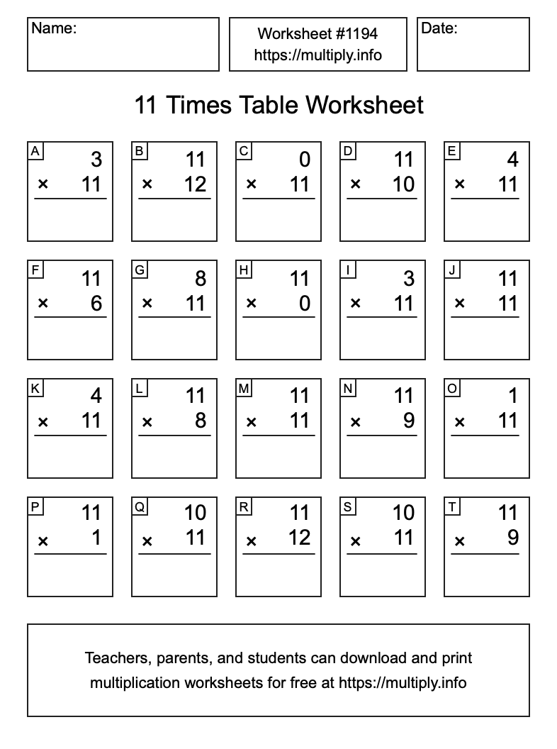 Here is the 11 Times Table Worksheet #1194. This worksheet contains problems related to the multiplication table of 11. Print and/or save the worksheet using the buttons below the image. You can also drag or right-click on the image to download it to your device.
