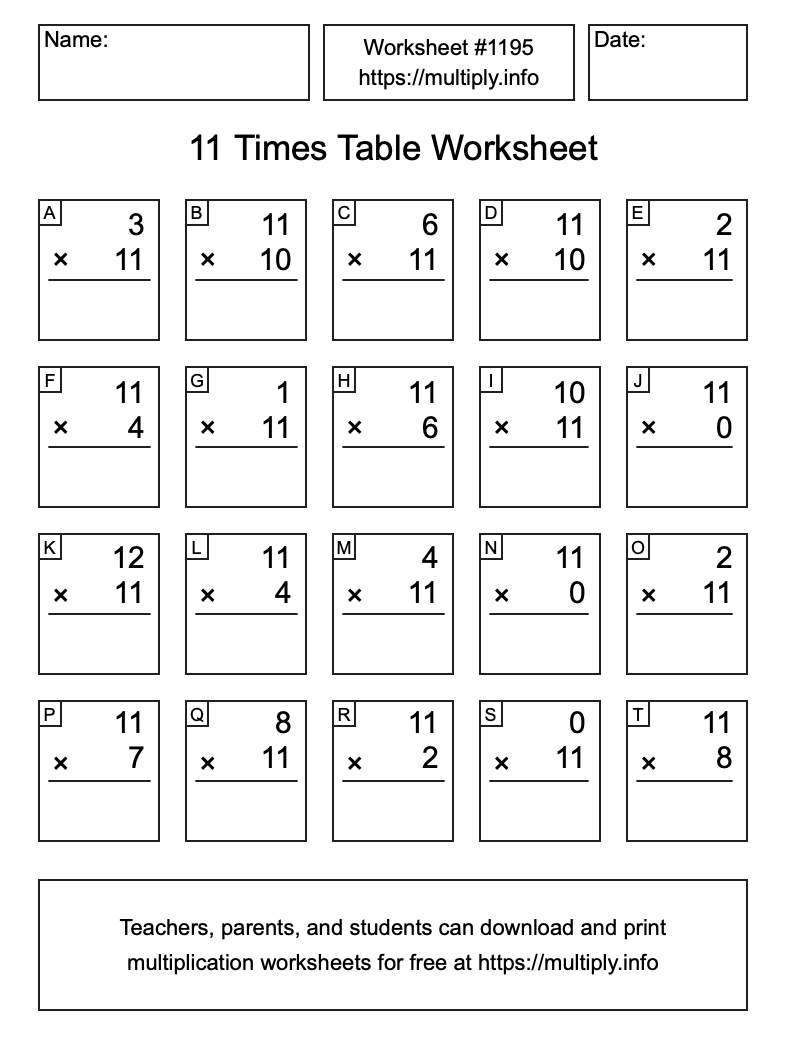 Here is the 11 Times Table Worksheet #1195. This worksheet contains problems related to the multiplication table of 11. Print and/or save the worksheet using the buttons below the image. You can also drag or right-click on the image to download it to your device.