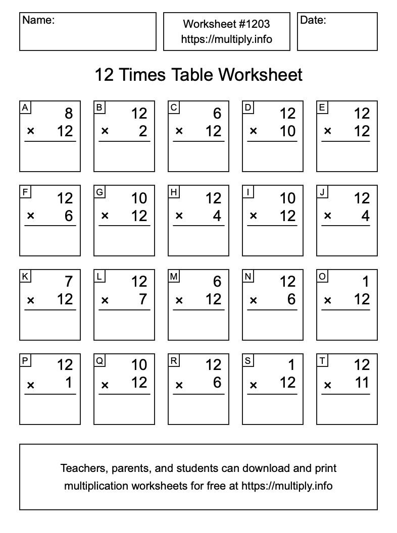12 Times Table Worksheet #1204