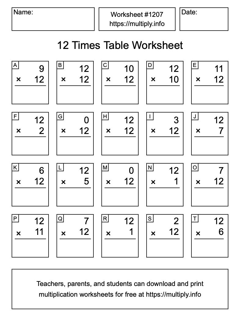 Here is the 12 Times Table Worksheet #1207. This worksheet contains problems related to the multiplication table of 12. Print and/or save the worksheet using the buttons below the image. You can also drag or right-click on the image to download it to your device.