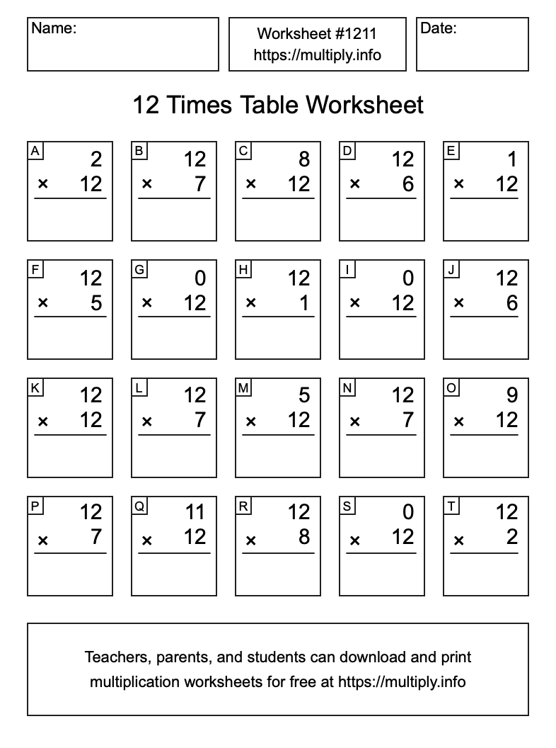 Here is the 12 Times Table Worksheet #1211. This worksheet contains problems related to the multiplication table of 12. Print and/or save the worksheet using the buttons below the image. You can also drag or right-click on the image to download it to your device.
