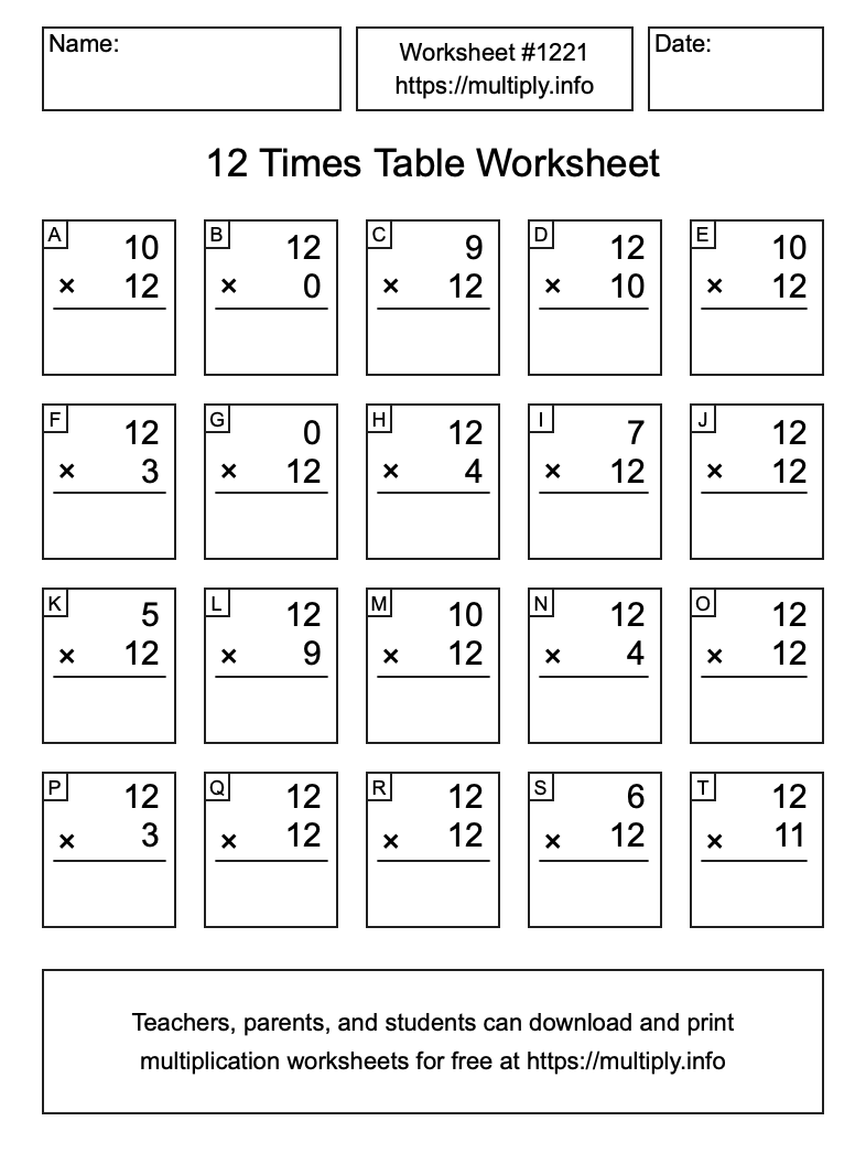 Here is the 12 Times Table Worksheet #1221. This worksheet contains problems related to the multiplication table of 12. Print and/or save the worksheet using the buttons below the image. You can also drag or right-click on the image to download it to your device.