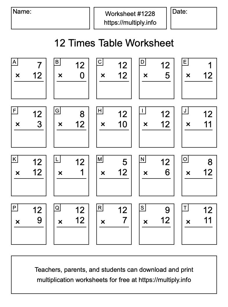 Here is the 12 Times Table Worksheet #1228. This worksheet contains problems related to the multiplication table of 12. Print and/or save the worksheet using the buttons below the image. You can also drag or right-click on the image to download it to your device.