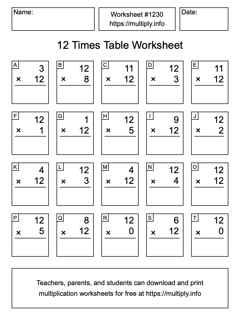 Here is the 12 Times Table Worksheet #1230. This worksheet contains problems related to the multiplication table of 12. Print and/or save the worksheet using the buttons below the image. You can also drag or right-click on the image to download it to your device.
