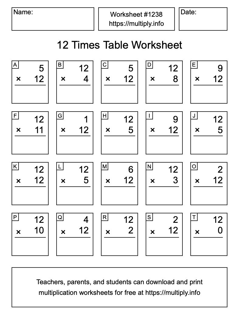 Here is the 12 Times Table Worksheet #1238. This worksheet contains problems related to the multiplication table of 12. Print and/or save the worksheet using the buttons below the image. You can also drag or right-click on the image to download it to your device.