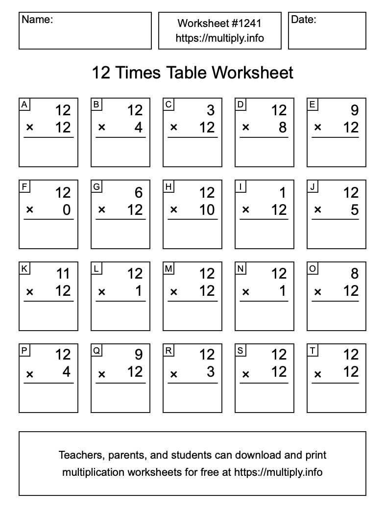 Here is the 12 Times Table Worksheet #1241. This worksheet contains problems related to the multiplication table of 12. Print and/or save the worksheet using the buttons below the image. You can also drag or right-click on the image to download it to your device.