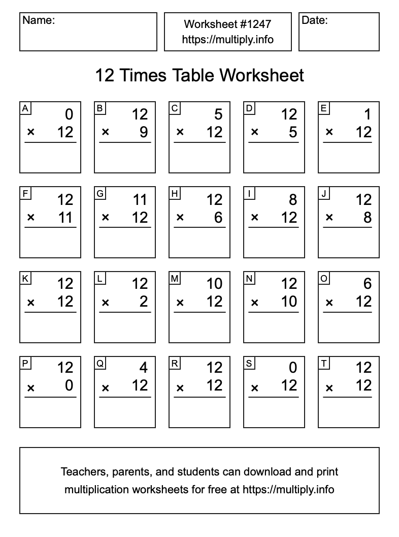 Here is the 12 Times Table Worksheet #1247. This worksheet contains problems related to the multiplication table of 12. Print and/or save the worksheet using the buttons below the image. You can also drag or right-click on the image to download it to your device.