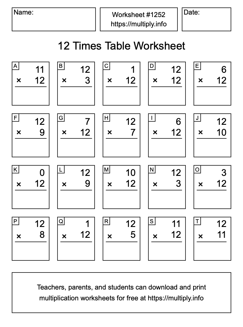 Here is the 12 Times Table Worksheet #1252. This worksheet contains problems related to the multiplication table of 12. Print and/or save the worksheet using the buttons below the image. You can also drag or right-click on the image to download it to your device.