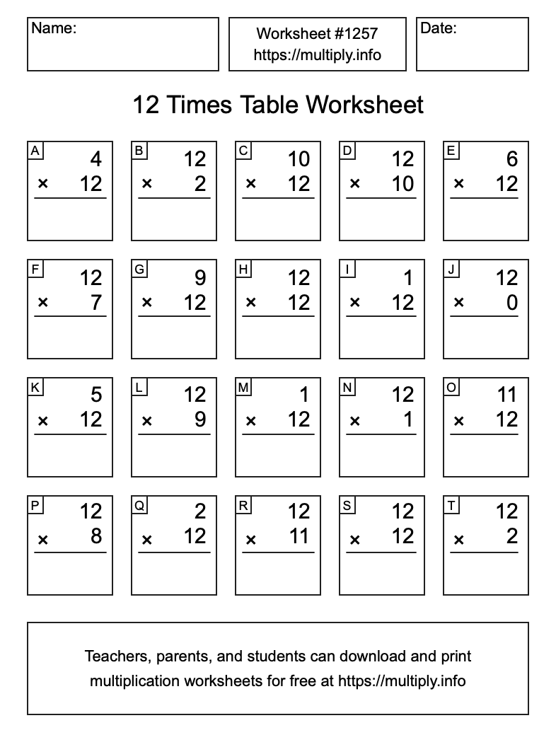 Here is the 12 Times Table Worksheet #1257. This worksheet contains problems related to the multiplication table of 12. Print and/or save the worksheet using the buttons below the image. You can also drag or right-click on the image to download it to your device.