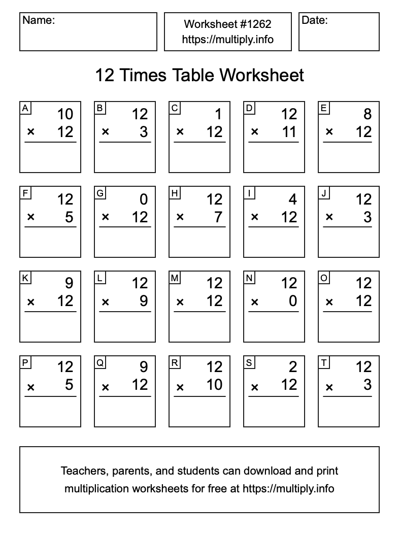 Here is the 12 Times Table Worksheet #1262. This worksheet contains problems related to the multiplication table of 12. Print and/or save the worksheet using the buttons below the image. You can also drag or right-click on the image to download it to your device.