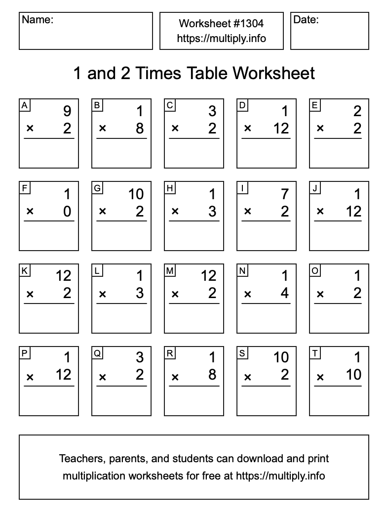 Here is the 1 and 2 Times Table Worksheet #1304. This worksheet contains problems related to the multiplication table of 1 and the multiplication table of 2. Print and/or save the worksheet using the buttons below the image. You can also drag or right-click on the image to download it to your device.